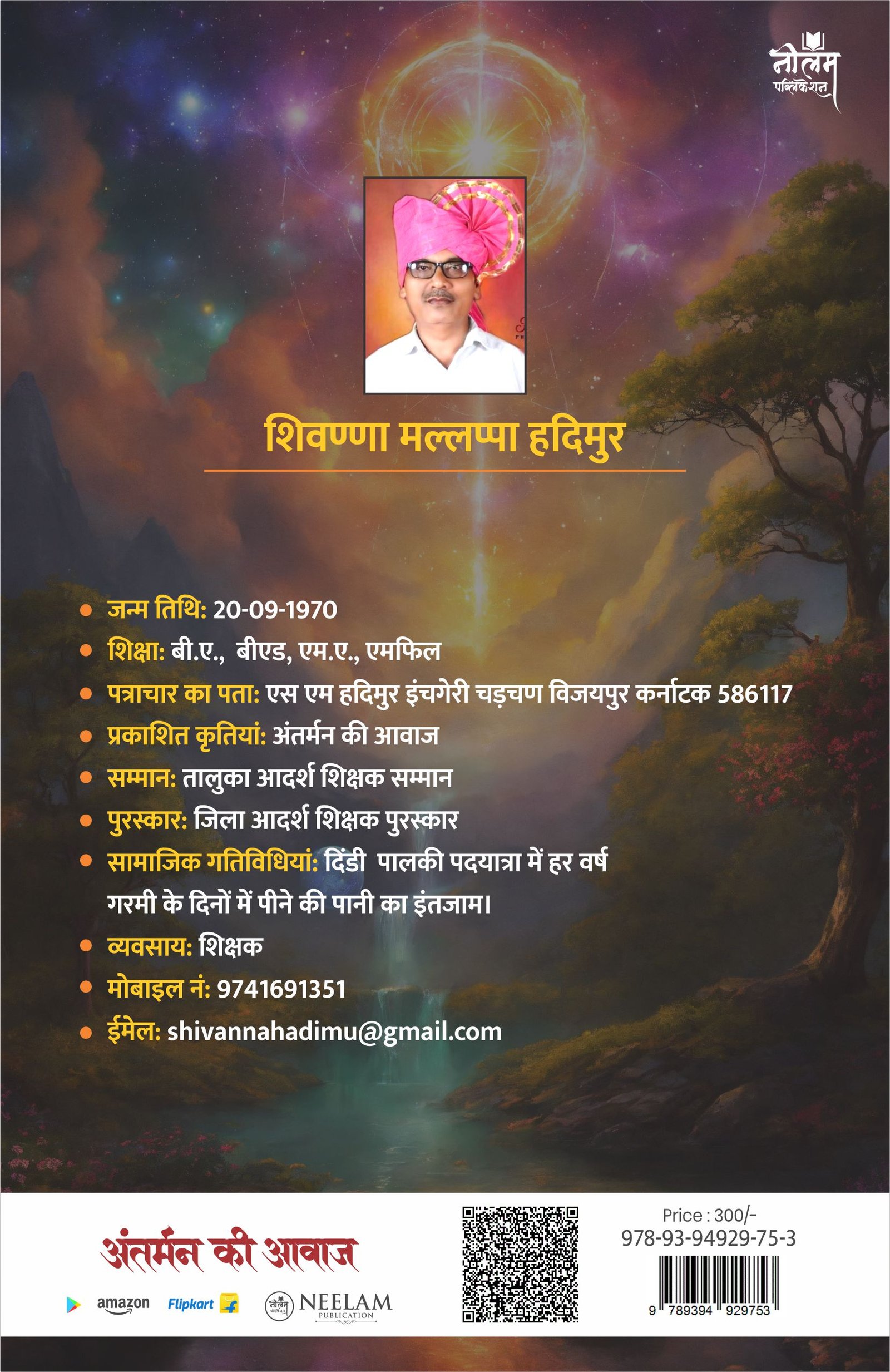 Antarman Ki Aawaz : For my poetry collection “Antarman ki Awaaz”, this poetry collection became complete with the inspiration and blessings of Shri Samarth Sadguru Revansiddheshwar Maharaj Ji. Mister. Vivekananda Arali ji and my elder brother Shri. Siddalingapp Hadimur ji guided me. Two of my close disciples, Shri Mallikarjun Balgaon (Teacher) and Dr. Shivanand Koli (PhD) have participated in the creation of this work and my literary friends from “Prem Deep Sahittik Manch Ingaleshwar” have also inspired me.